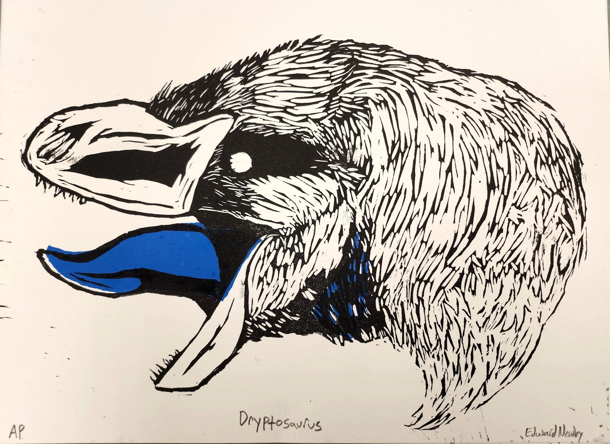 This linoleum block print shows the fearsome head of Dryptosaurus with a dazzling blue tongue. The negative space carved into the block makes for a highly detailed plumage of feathers. While not based in any scientific knowledge of the animal, the image draws inspiration from the Blue Tongue Skink and fellow Tyrannosauroid Yutyrannus to create a highly speculative representation of Dryptosaurus.