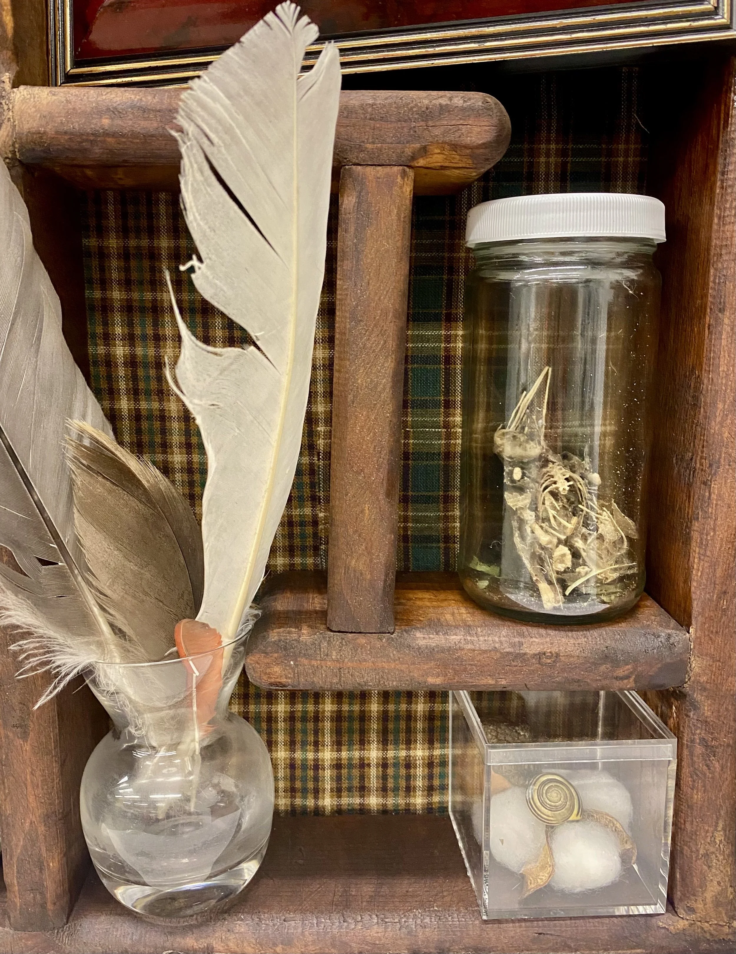 Creature Comforts is a collection of animal figurines as well as natural objects such as taxidermy, found feathers, a regurgitated bird skeleton, and a snail shell. The shelf was bought from Facebook Marketplace and stained a darker brown.