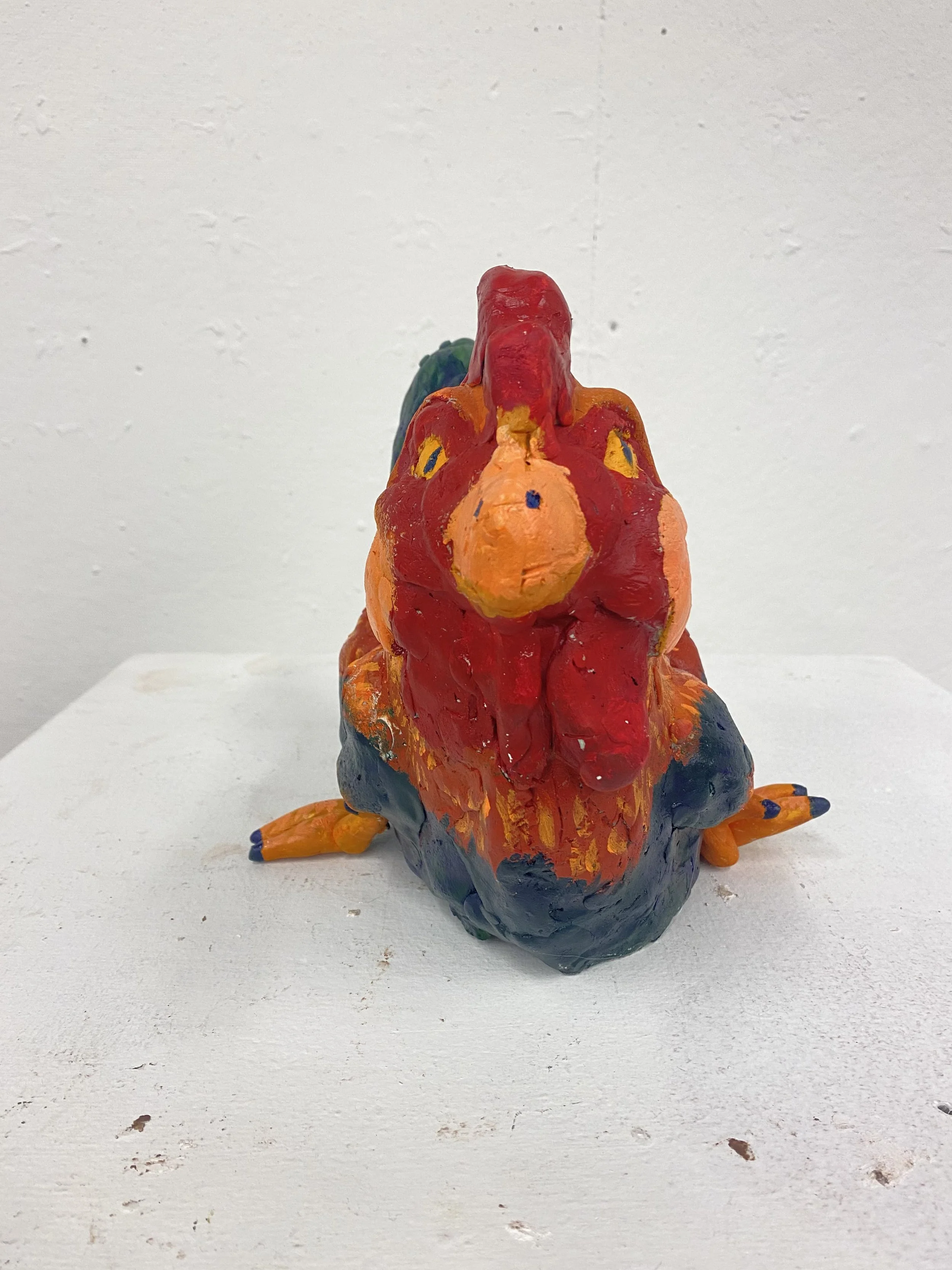 Rooster Raptor is a visual representation of the gradual evolution from Dromaeosaur dinosaur to the modern chicken. It has the colors and iconic waddles of a chicken, but the snout and clawed feet of a velociraptor.